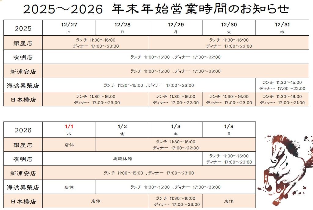 2025 1219 NEWS ◎◎各店 年末年始営業時間のお知らせ◎◎ Post Share Hatena Line RSS feedly Pin it note この記事のタイトルとURLをコピーする 平素よりご愛顧いただき誠にありがとうございます。各店の年末年始の営業時間は下記の通りとなります。 本年もご愛顧いただきありがとうございました。来年も変わらぬご愛顧のほど、よろしくお願い申し上げます。 Post Share Hatena Line RSS feedly Pin it note 鹿児島黒豚サムギョプサルフェアスタート 前の記事